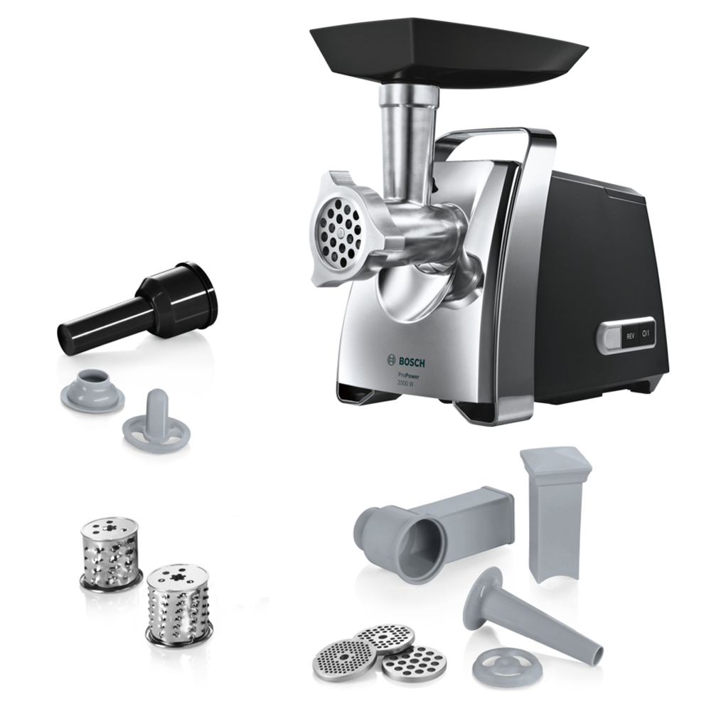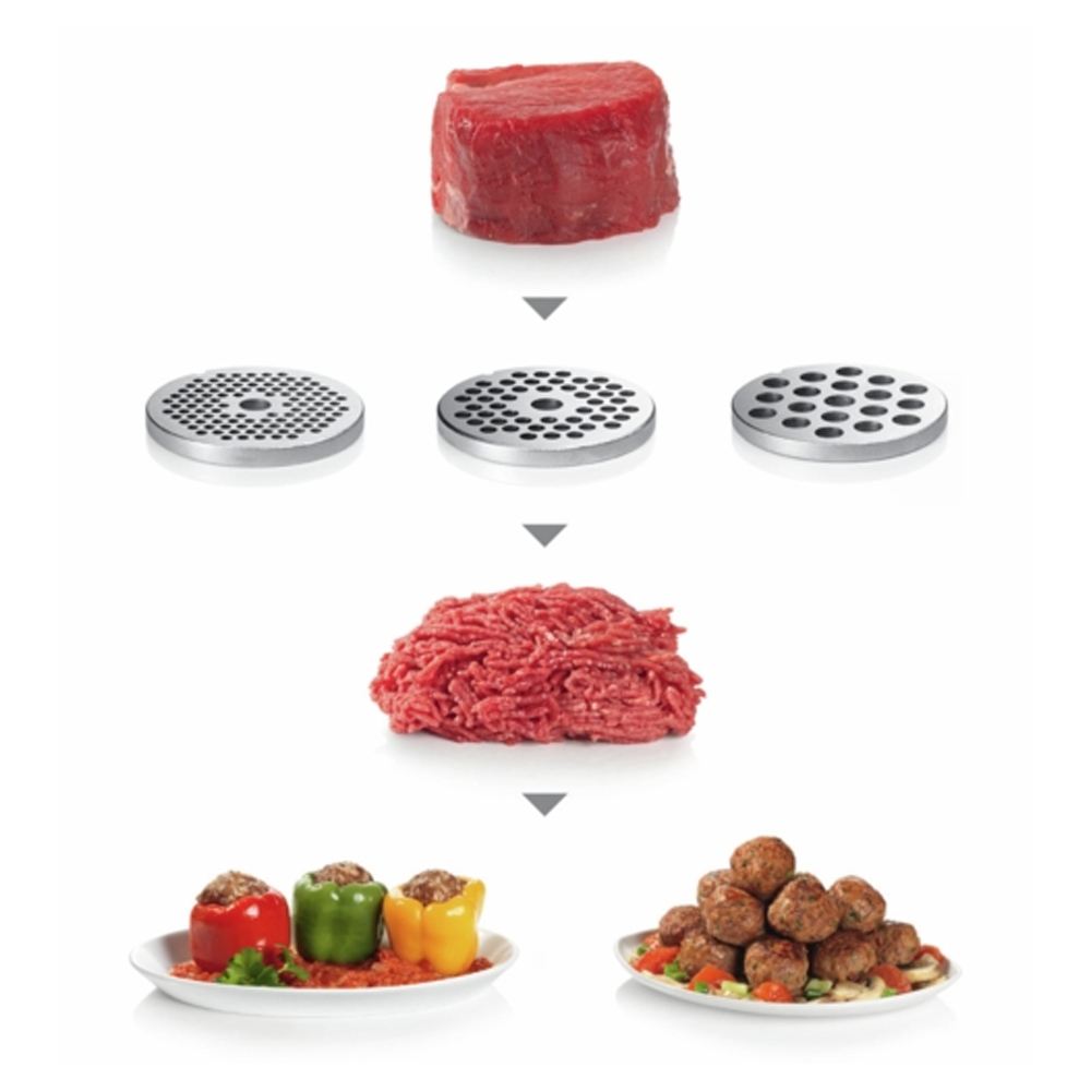 • Боја: црна/инокс • Месорезница величина 8 • Додаток за дробење x 2 • Сигурносен бравен спој • Гумени ногички • Голем сад за ставање на состојките • Вграден простор за чување на додатоците • Типка за вклучување / исклучување • Едноставна за спремање • Продолжеток за полнење колбасици • Мелење на месо 3,5 kg/min • Приклучна сила: 700 W • 1 степен на делување
