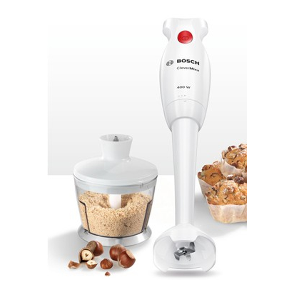 • Боја: бела • Моќност на моторот (max): 400 W • Универзална сецкалка за стругање, сецкање и дробење на лук, зачини, сирење, месо, ореви и припрема на сосови за леб, десерти, меки пецива, храна за бебиња, кој го сочинуваат: горен дел и лонче, • Нож од инокс со големо сечиво за брзо дробење, мешање и сецкање, • Дроби и мраз • 2 чаши • Сите делови (освен горниот дел со моторот) се погодни за миење во машина за садови • Број на брзини за лесно ракување: 1 • Ергономско обликуван дводелен штапен миксер