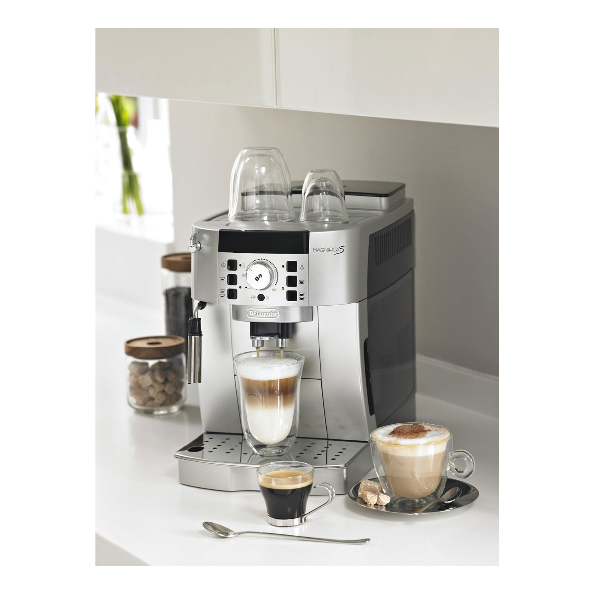 Елегантен надворешен финиш во сребрена боја со црни детали Контролна плоча со икони Потполно автоматски апарат за правење на еспресо и капучино Подесување на количината на кафе и количината на водата и константна температура на кафето Изберете помеѓу кратко, средно, или долго , јако или екстра блага арома , уживајте во врела, топло или млако кафе зависно од температурата Интегриран одстранувачки млин за кафе со 13 подесувања на крупноста на кафето Moжност на меморирање на функцијата мое кафе Работи со мелено како и со немелено кафе “Cappuccino Sistem -систем кој :меша пара, воздух , млеко и прави богата крема за капучино Подесива висина на левакот за кафе за различни шољи ( од 86 до 142 см) Автоматско исклучување Бројач на направените кафиња Електронски термостат за пареа и за еспресо Подесувачко испуштање на пареата Прекинувач со индикаторска сијаличка Термо блог грејач за греење на водата за припремање на врело кафе Одвоив прозирен резервоар за вода (1,8л) Сад за собирање на водата за капење Stand by функција Eco Energy saving-заштеда на електрична енергија Eco Sleep Mode- програмирање на апаратот да се се исклучи од 15 мин.до 3 часа по неговата последна употреба Автоматски програми за плакнење и одстранување на каменецот Загревање на шољите Пумпа со притисок 15Bar Тежина 9 кг Приклучна сила: 1450 W Димензии 351x238x430(mm)