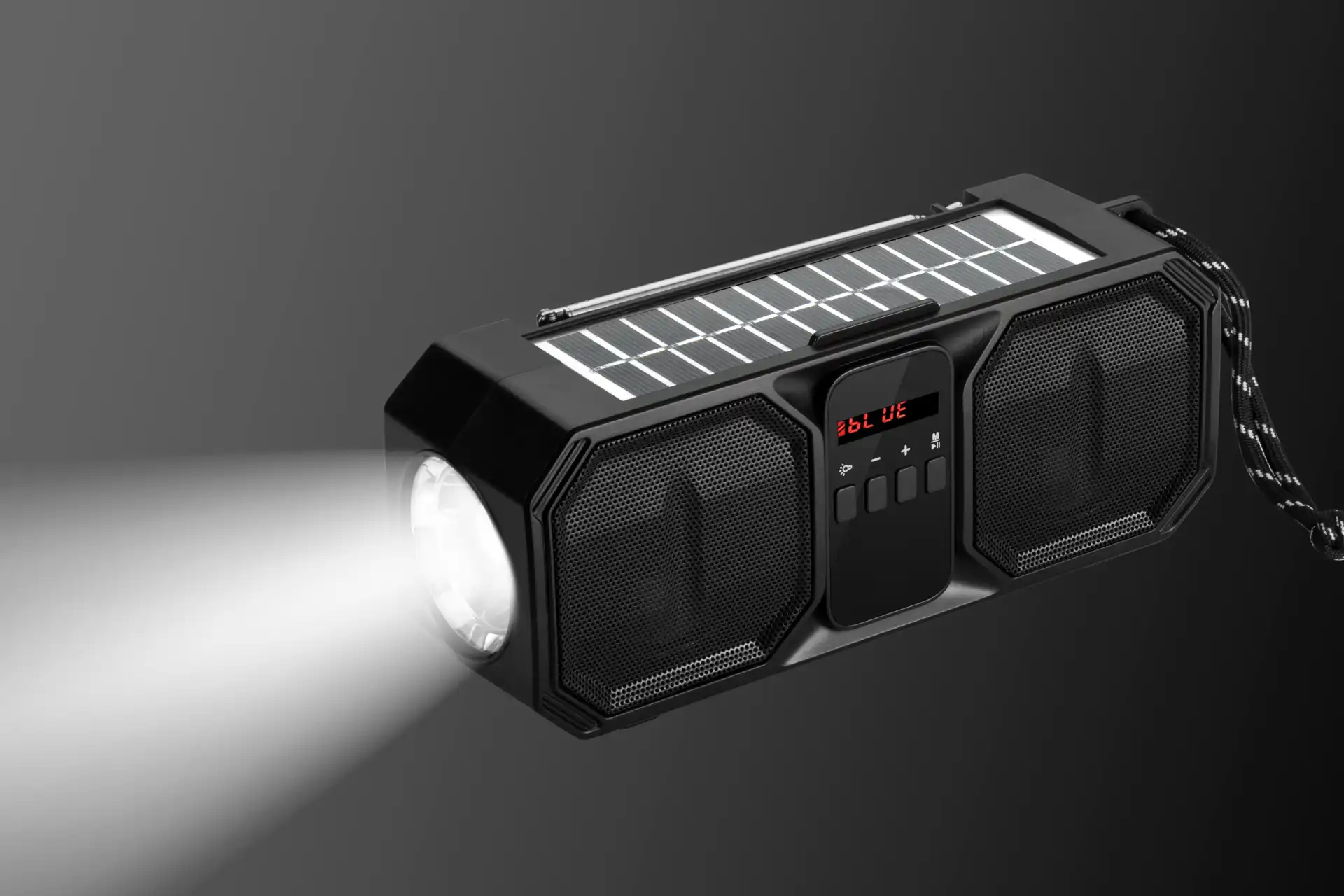 Безжичен Bluetooth звучник со вградена полначка батерија (1.200mAh) • Соларен панел за полнење • Bluetooth 5.0 • USB приклучок и Micro SD слот за MP3 репродукција • USB приклучокот може да се користи за полнење на телефони • Вграден FM радио • Вградено LED светло (фенерче) • Време на работа – до 5 часа со едно полнење (на 50% јачина на звук) • Максимална излезна моќност: 80W (8W RMS) • Содржи еден активен звучник + еден пасивен звучник • TWS функција (поврзи 2 уреди за стерео звук)