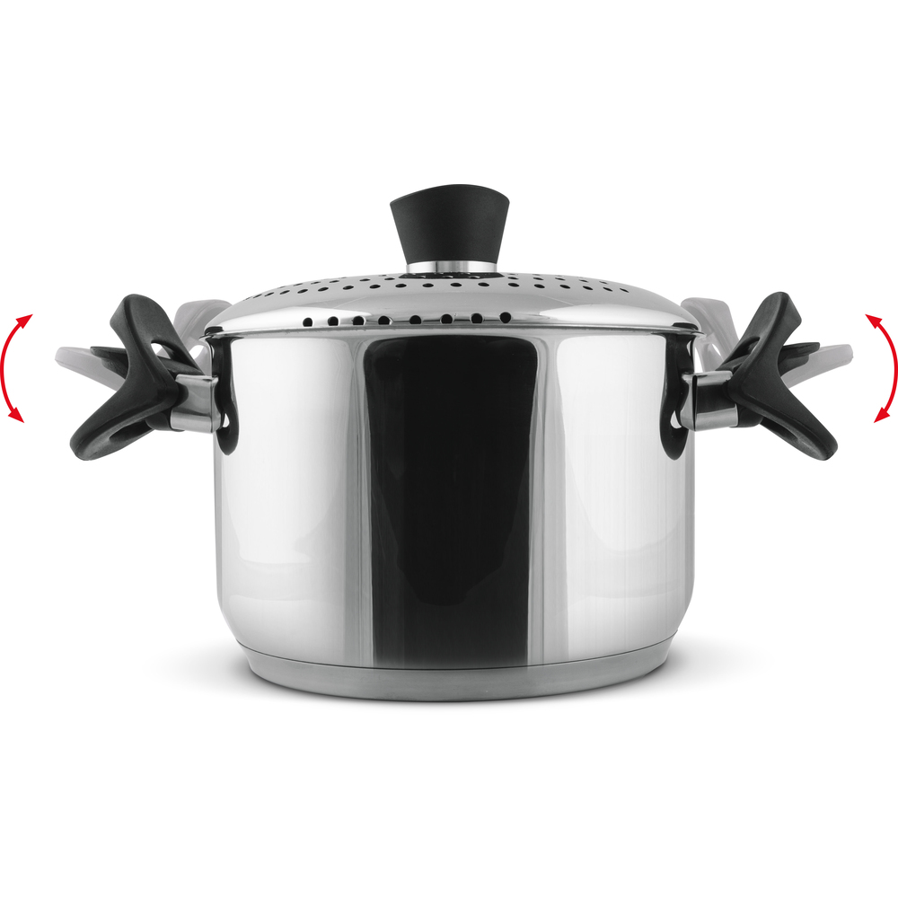 • Тенџере со капак со дупчиња, за тестенини • Висококвалитетен сад од нерѓосувачки челик • Брзо готвење на база на акумулирање на топлината • Масивно дно • Здраво и брзо готвење • Бакелитни дршки • Лесно цедење на тестенините благодарение на дупчињата во капакот • Пречник / литража: – 24 cm / 5,8 l