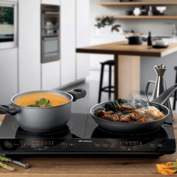 Двојна индукциска плоча, ултра брза Моќност: 2000W + 1500W Стаклено-керамичка плоча LED дисплеј со сензорски контроли 10+8 нивоа на моќ (200-2000W) Тимер до 4 часа Температурен опсег: 60-240°C Дијаметар на садот до 27 см Компактна магнитна посуда 280x280mm (X2) Со детектор за безбедност Автоматско исклучување по 2 часа Со заштита од прегревање Тежина: 4,7 кг / Дебелина: 6,5 см Димензии: 58x35x6,5 см