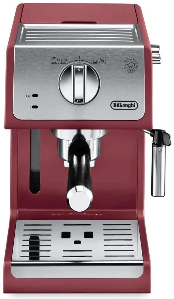 Тежина (Kg): 4 Волтажа / фреквенција (V~Hz): 220-240 V / 50-60 Hz Моќност (W): 1100 Боја: Црвена Автоматско исклучување Прави еспресо и капучино Систем за млеко Филтер за 1 или 2 чаши Држач за чашите Димензии (wxdxh) (mm): 185x240x305 Максимална висина на чашите (mm): 130 Притисок (bar): 15 Отстранлив сад за капки Отстранлив резервоар за вода Индикатор за вода Пакацитет на садот за вода (l): 1,1 Изработен од пластика Работи со мелено кафе и со ESE падови за кафе Број на филтри 3