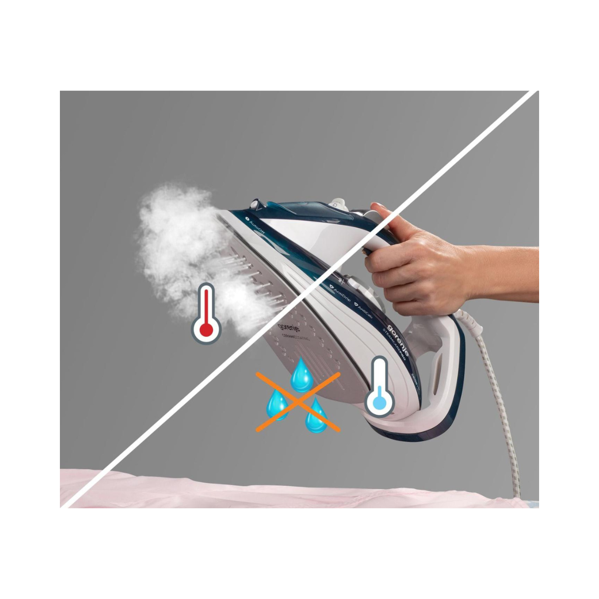 • Капацитет на резервоар 350 ml – Намалена потреба за надополнување • AntiCalc систем – Ефикасен начин за отстранување на бигор • AntiDrip систем – Чува облеката без дамки